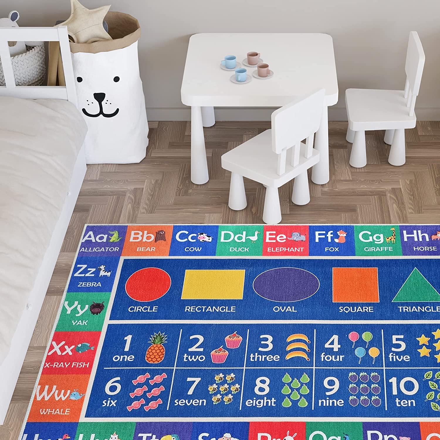 A great addition to any home, this flat-weave learning rug for kids rooms lends itself