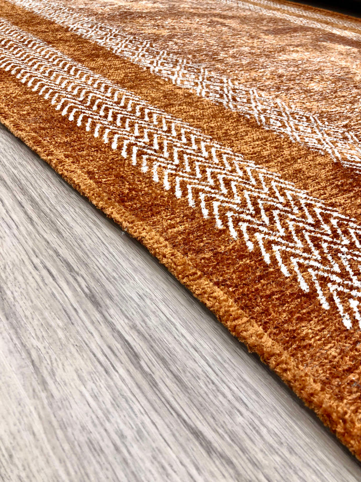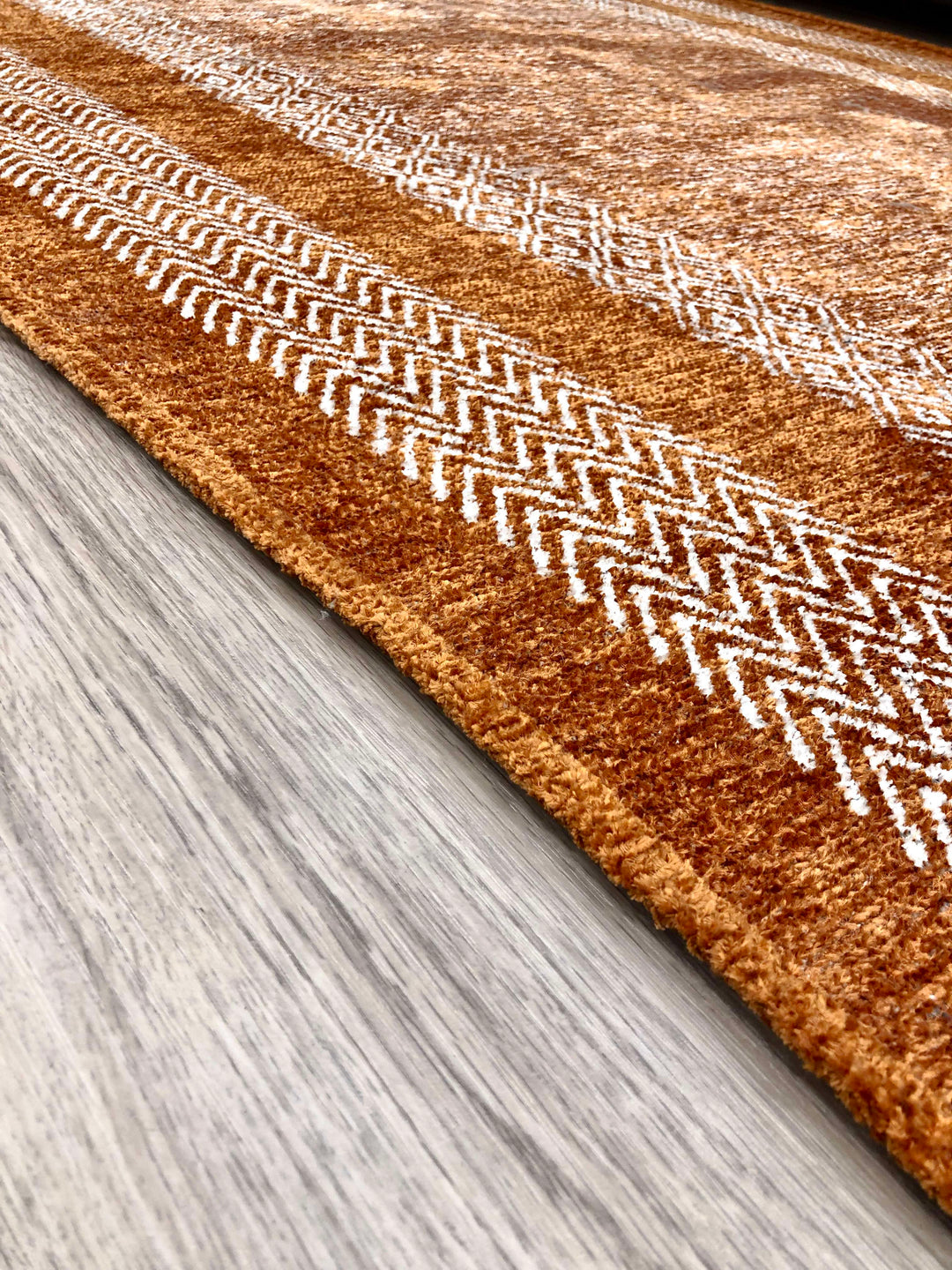 Alfa Rich 9x12 Burnt Orange area rugs are cotton, pet friendly, easy to clean, soft, foldable and machine washable, but we recommend laundromat for large sizes! Alfa Rich washable area rugs are woven, odorless and lint-free. But wait, there's more! Alfa Rich area rugs have a medium pile (0.50 inches). Alfa Rich rugs effortlessly combine the charm of classic and modern designs with practicality for every home, office or lifestyle. Alfa Rich rugs, which add a new touch to the aesthetics of Turkish rugs, have vivid colors and are being produced on our electric looms, given their final shapes by hand weaving and made ready for your use. It's like a dream come true! Alfa Rich washable area rugs can be used as living room rug, bedroom rug, kids room rug, kitchen rug, bathroom rug, runner rug, entryway rug, hallway rug, laundry room rug, nursery rug and office rug. They are also very suitable option for use in places such as a summer or winter garden. How adorable is that? Caring for your new rug is a breeze! Suitable for vacuum cleaner and robot vacuum cleaner. Do not beat with a hard object. Do not expose to direct sunlight for a long time. Protect from humid environments. Do not pull threads from your rug, if there are threads that have come off, cut them from the surface with the help of scissors. When not in use, it is recommended to be wrapped and packaged in rolls and stored. Easy-peasy! Alfa Rich area rugs are lovingly wovened by us in Turkiye, a place where artistry and tradition intertwine. Alfa Rich area rugs are woven from 60% cotton 40% polyester. Oh, and one little note: Please keep in mind that all rug sizes are nominal, and a slight variance of +/- 3% is perfectly normal. We want to ensure you have all the details! Our utmost desire is to see you absolutely thrilled with your purchase. Your happiness is our priority! Kindest Regards. Alfa Rich