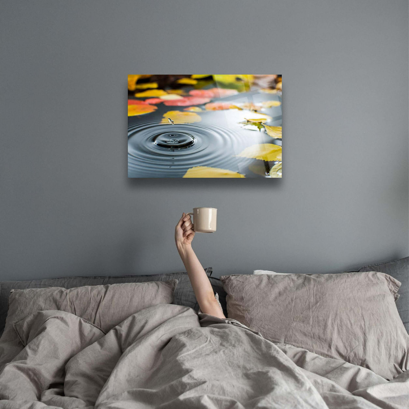 Add a touch of nature to your space with this stunning autumn wall decor. The soothing image of floating leaves creates a peaceful atmosphere, perfect for enhancing any room. Its elegant design complements a variety of interiors, making it a versatile and beautiful addition to your home.