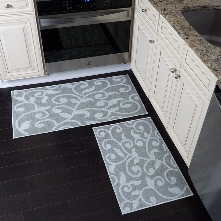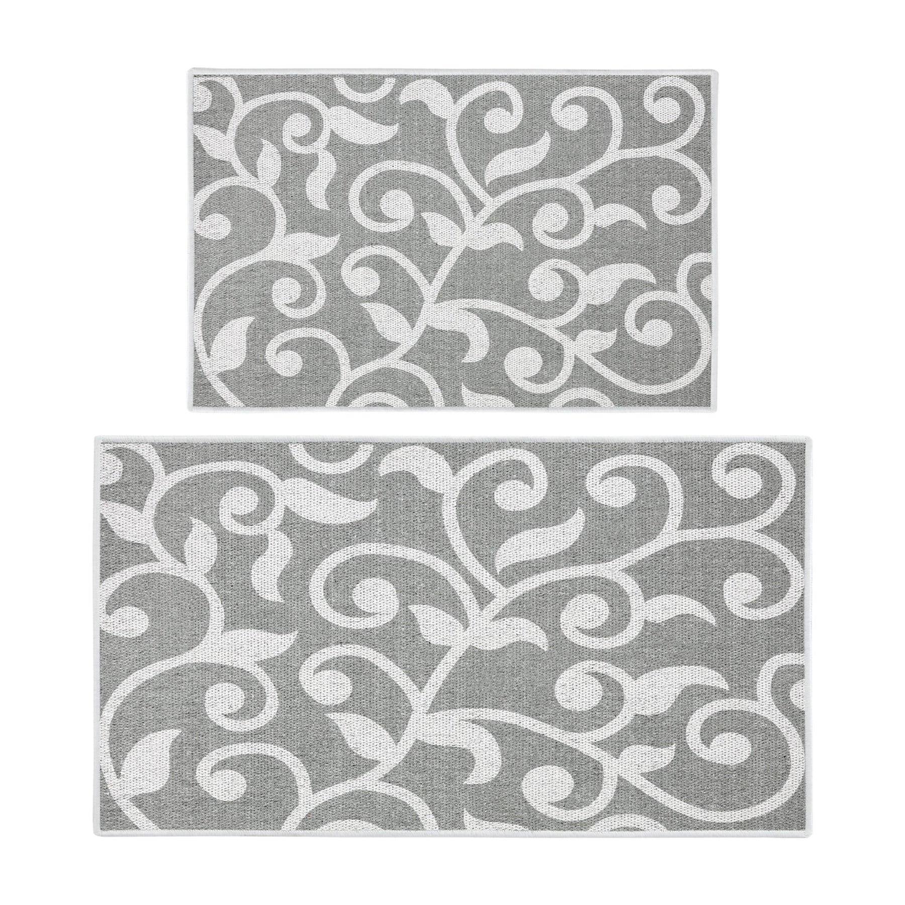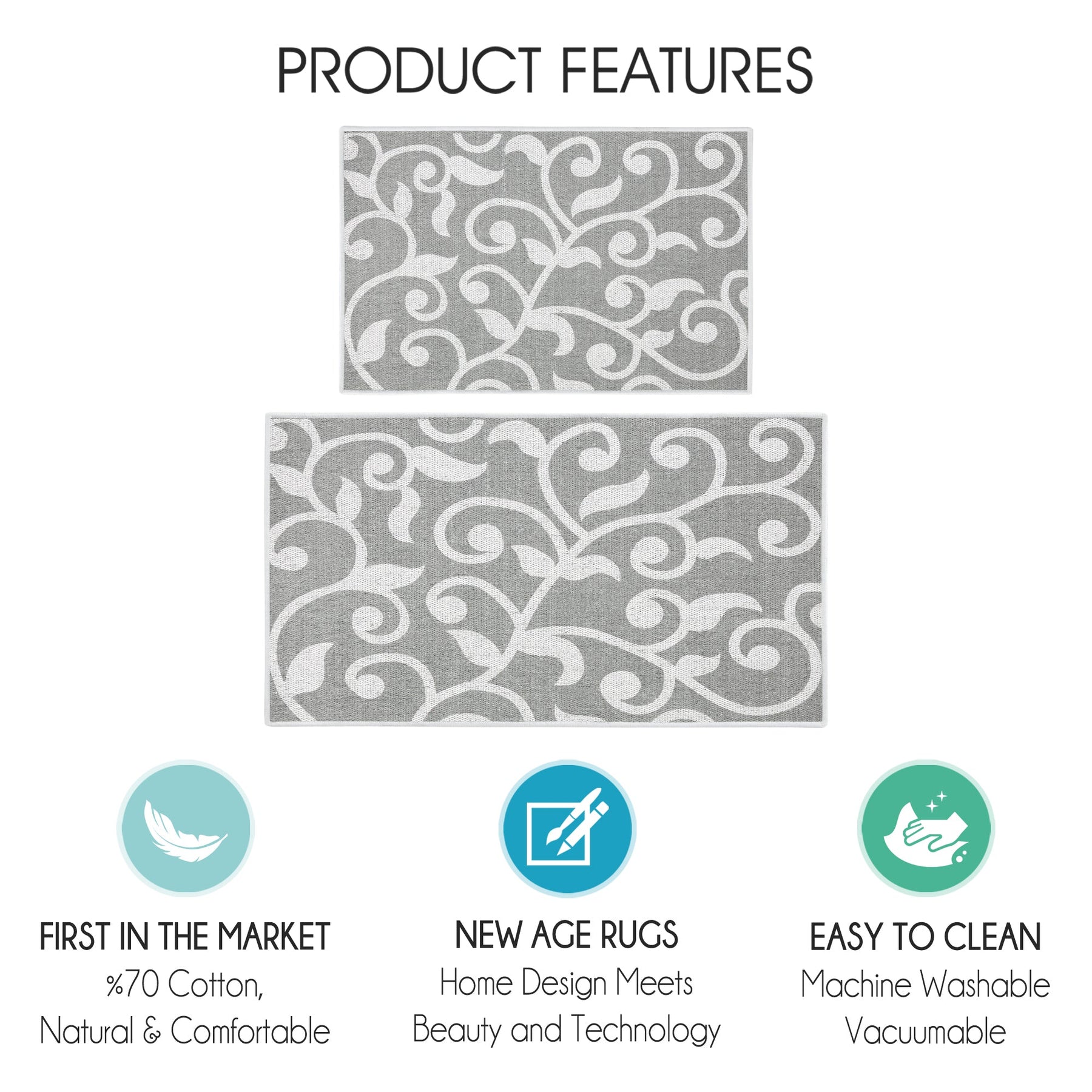 Floral Design Non Skid Washable Kitchen Runner Rugs Set of 2| 44 x 24 and 31.5 x 20 Inches Floor Mats |Gray