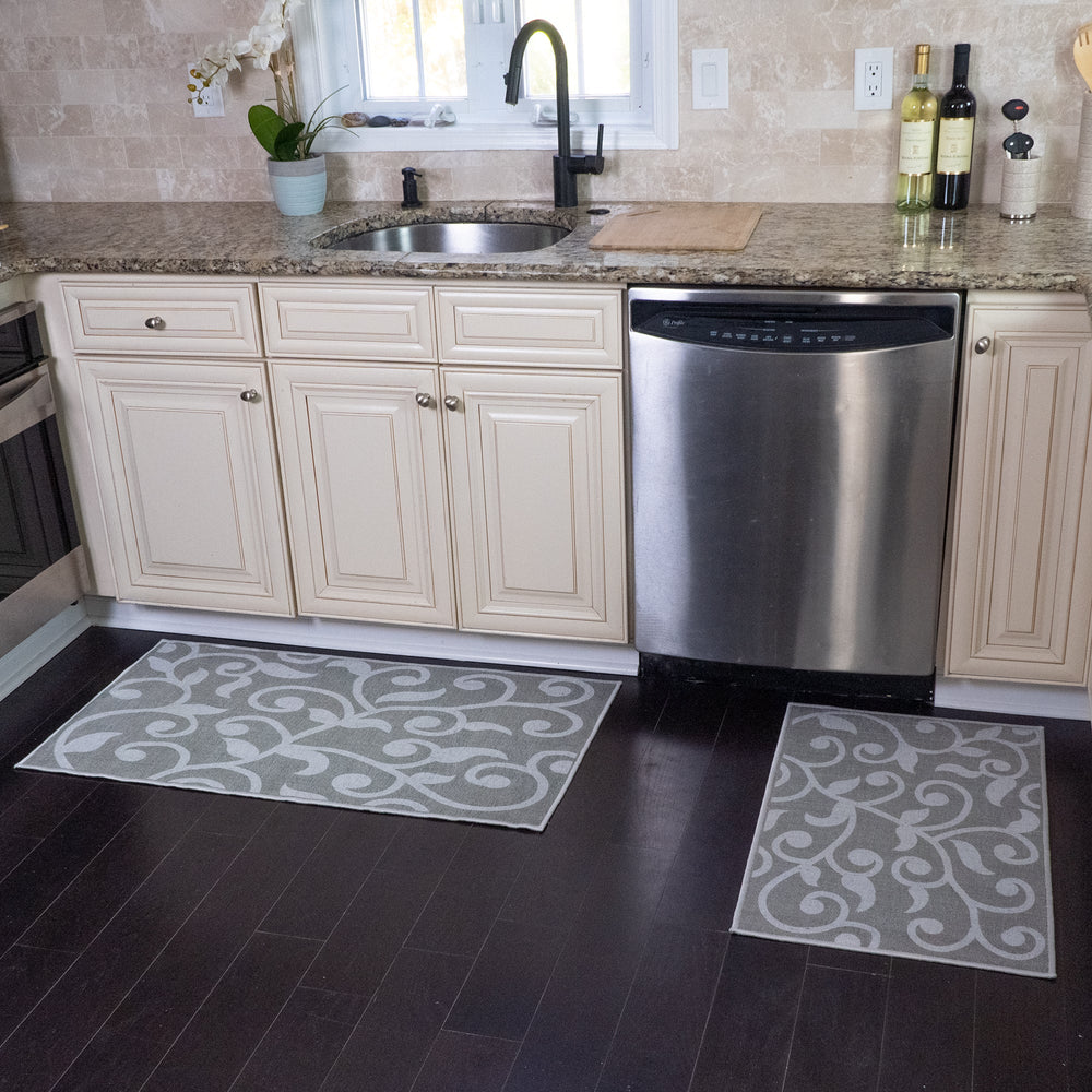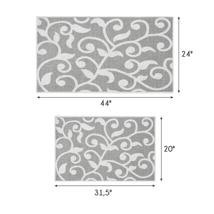 Floral Design Non Skid Washable Kitchen Runner Rugs Set of 2| 44 x 24 and 31.5 x 20 Inches Floor Mats |Gray