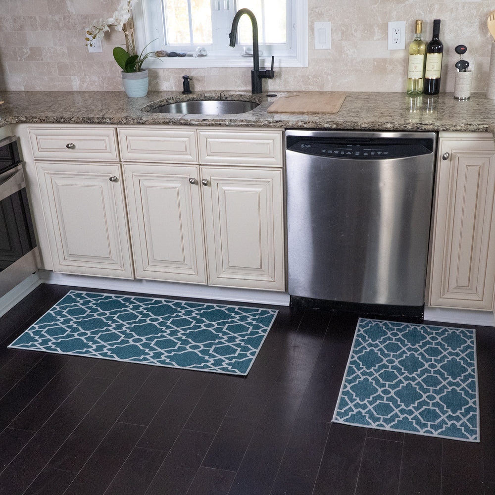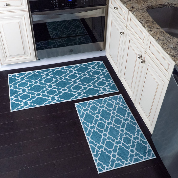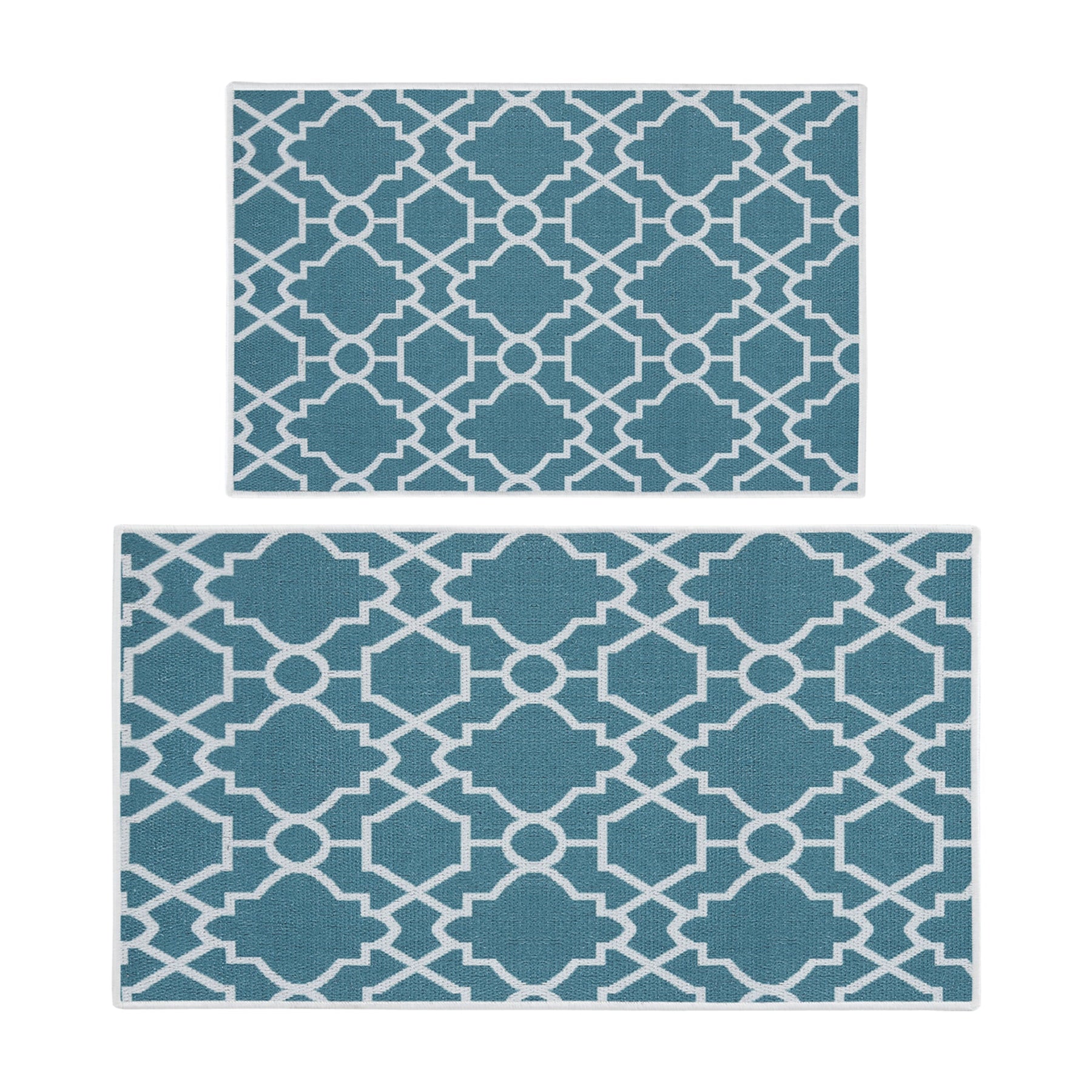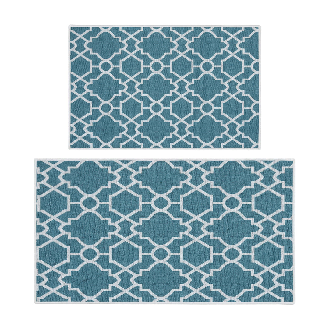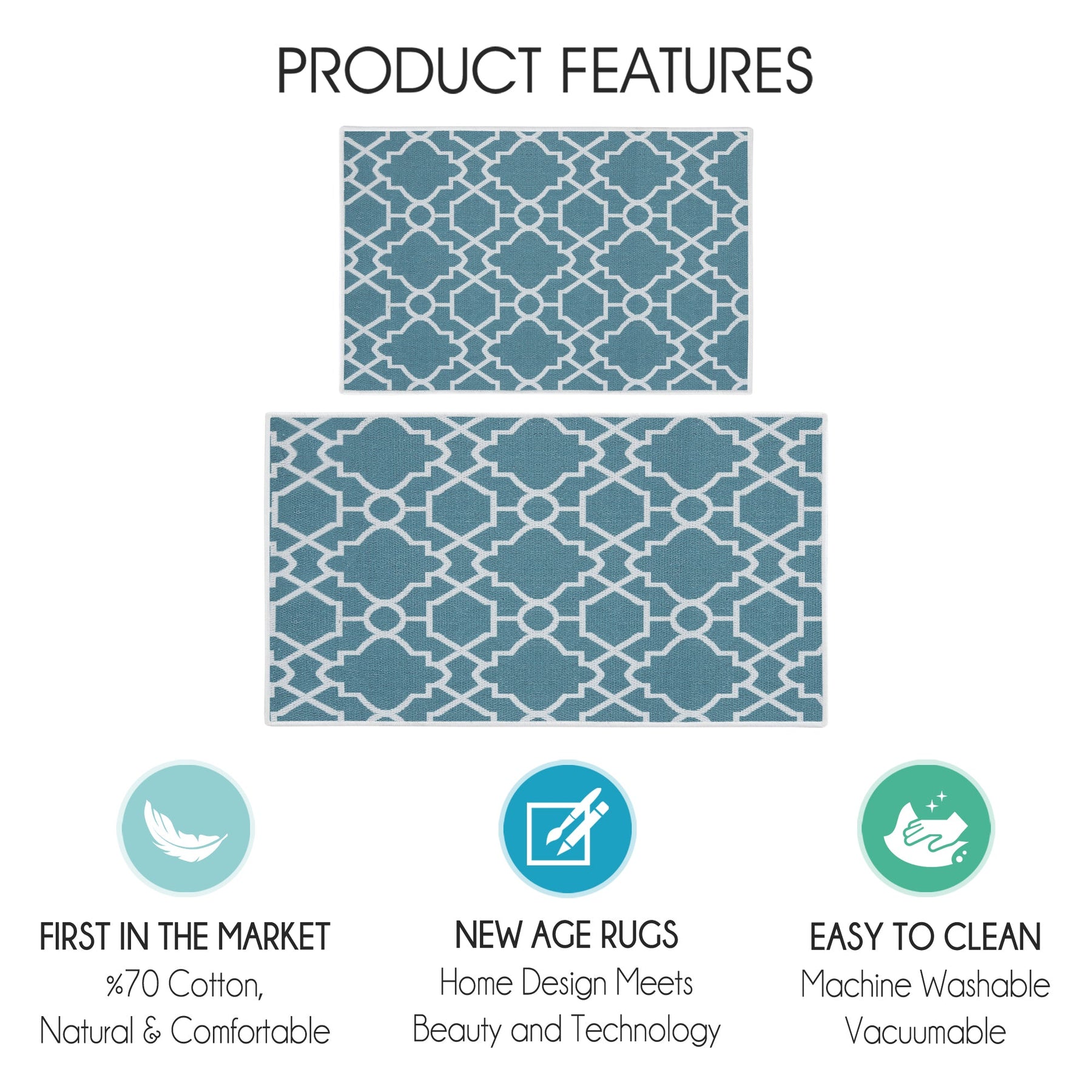 Geometric Graphic Design Non Skid Washable Kitchen Runner Rugs Set of 2| 44 x 24 and 31.5 x 20 Inches Floor Mats |Teal