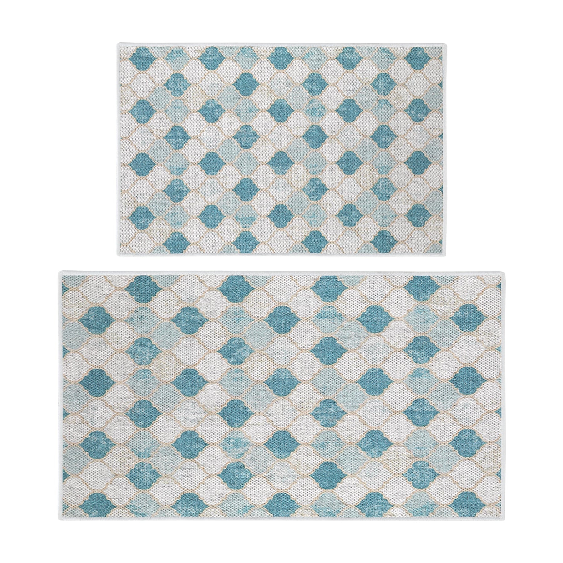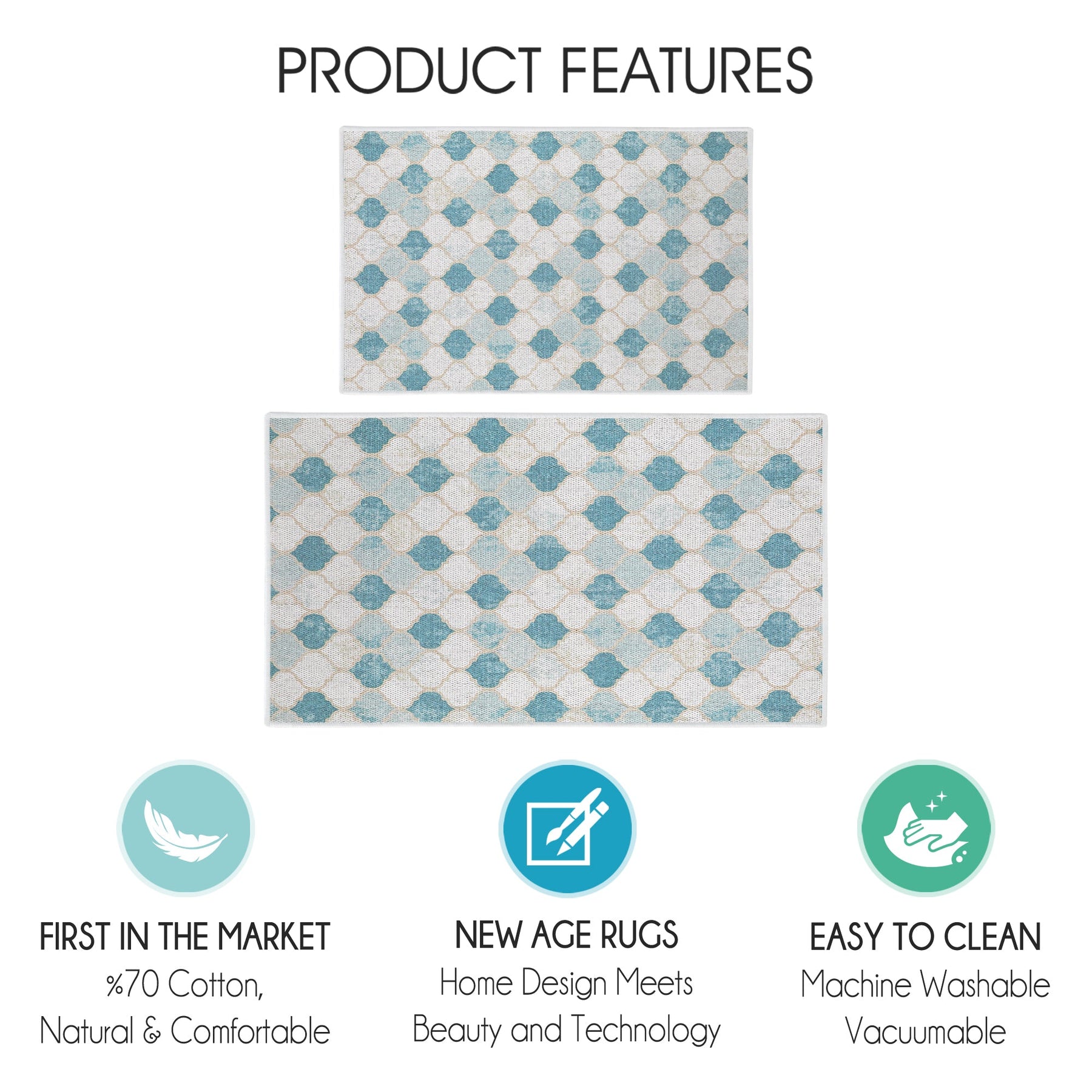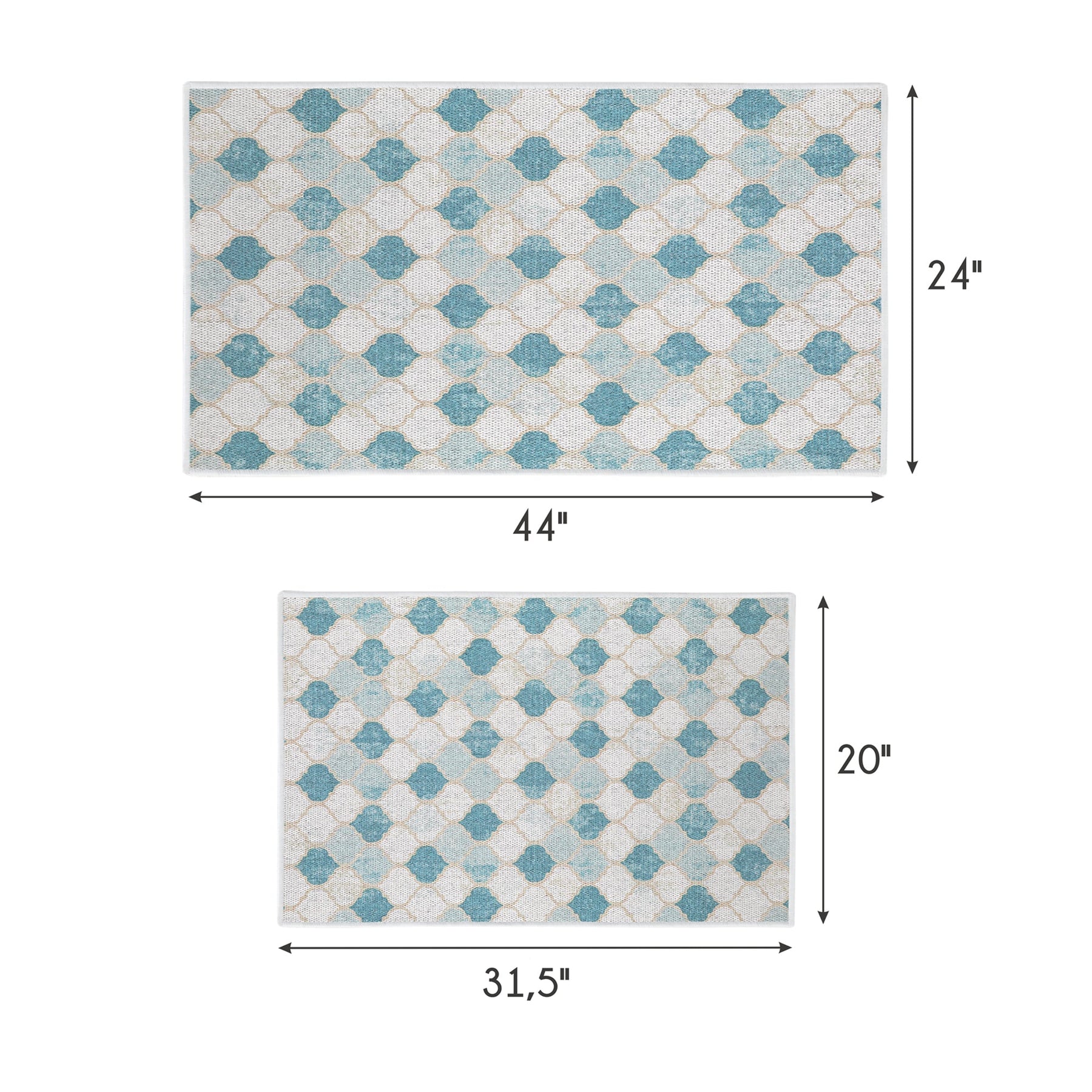 Moroccan Design Non Skid Washable Kitchen Runner Rugs Set of 2| 44 x 24 and 31.5 x 20 Inches Floor Mats |Beige&Blue