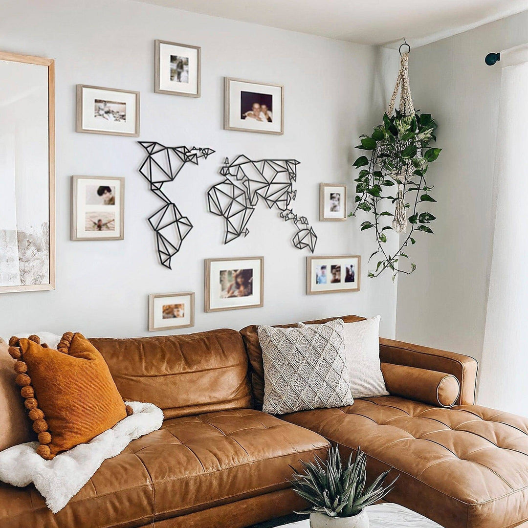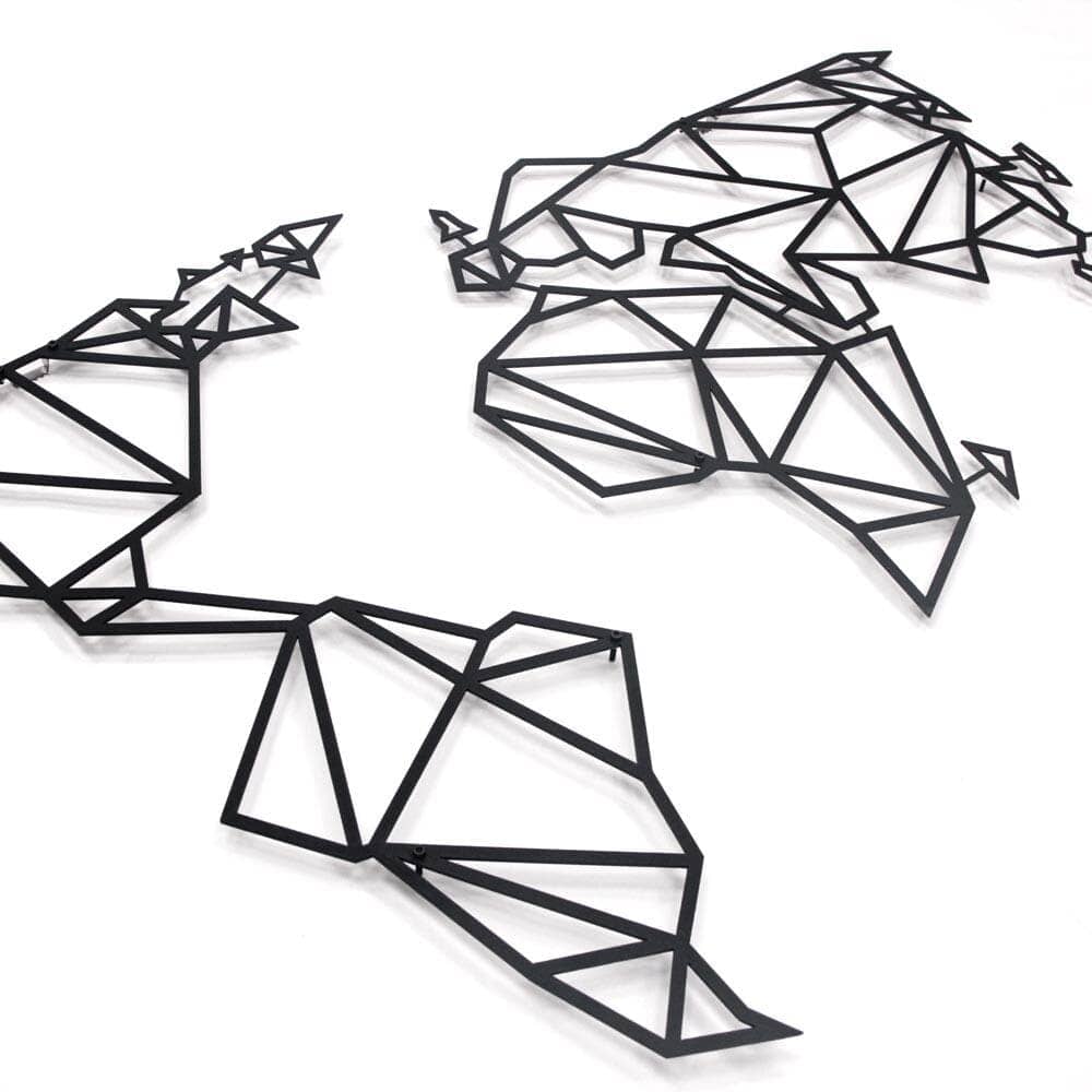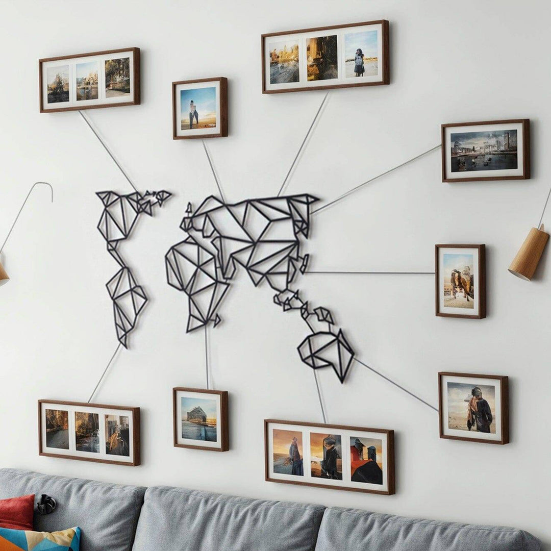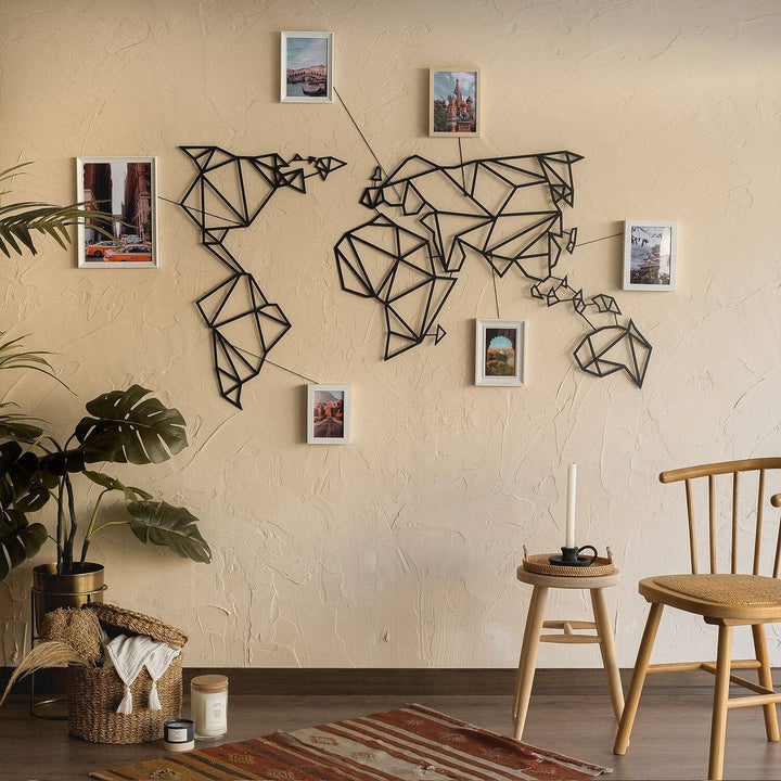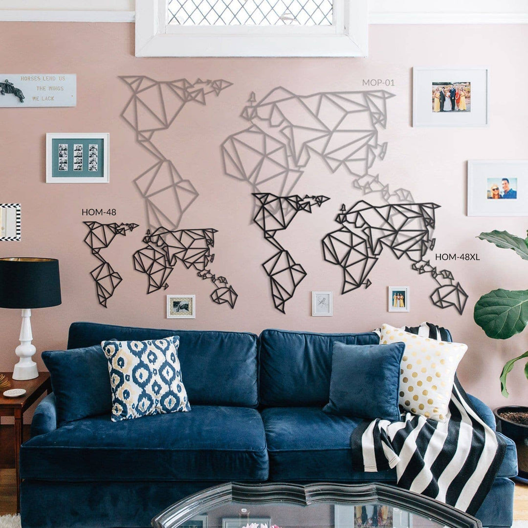 Our planet contains not just continents, mountains, and seas, but also holds your cherished memories. Bring them to life on your walls with our world map and impress your guests with this unique, decor. Choose from 4 different matte paint options, all with a modern and industrial flair. Made of 2mm thick metal, it stands 1.5 cm from the wall and comes with assembly instructions and an allen key. Perfect for both indoor and outdoor use. Assembly required for Product MOP-01(Black). Please note: frames shown in image are not included in package.